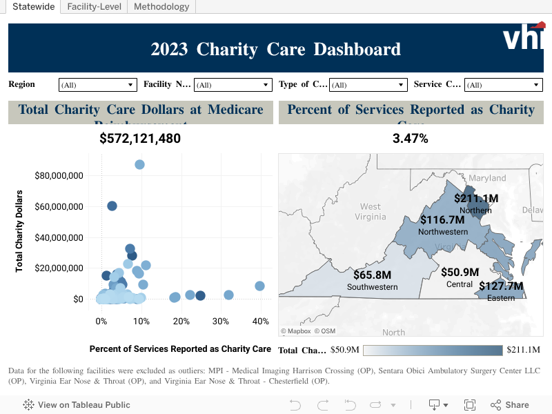 To meet these requirements, charity figures were collected from inpatient hospitals and outpatient providers for each facility’s fiscal year to compare the estimated amount of charity care reported. All charity care data was self-reported by inpatient hospitals and outpatient providers. VHI has no independent source to verify or validate the data that is submitted.